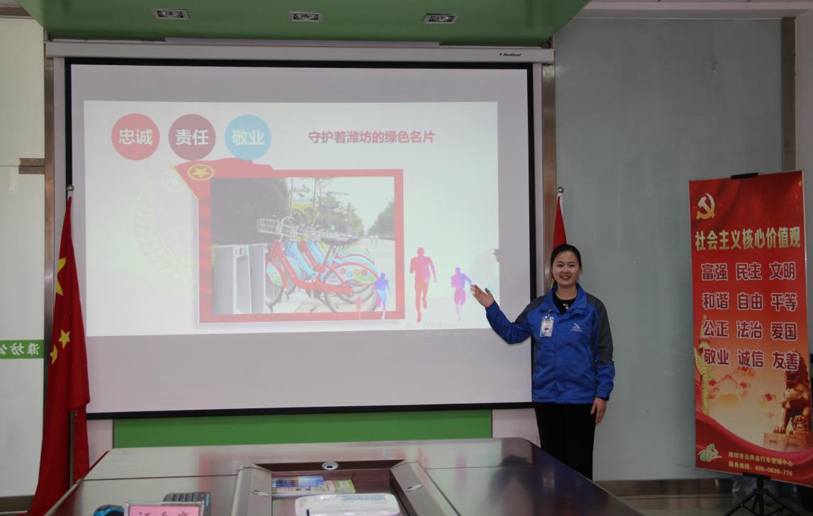 為更好地培育和踐行社會主義核心價值觀,弘揚愛崗敬業(yè)精神,營造整體積極向上的良好工作氛圍,4月11日下午,公共自行車管理中心同公共自行車運營公司開展了主題為“激揚青春智慧 爭當(dāng)崗位先鋒”的演講比賽。組織本次活動著力于挖掘年輕業(yè)務(wù)骨干,優(yōu)化公共自行車運營管理隊伍建設(shè),進(jìn)一步提高工作人員各方面素質(zhì),更好的提升公共自行車服務(wù)水平,為市民提供更好地服務(wù)。