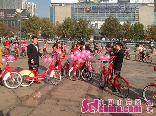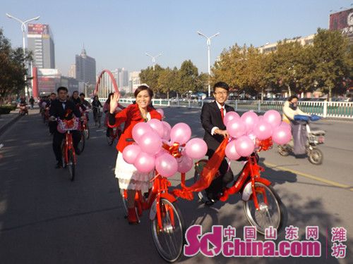 濰坊公共自行車試運行以來,得到了市民的認可和喜愛。記者在濰坊市公共自行車管理處了解到,用公共自行車來代替“婚車”在濰坊并不是第一例了,這樣的婚禮不僅低碳環(huán)保,又浪漫時尚。婚禮中的公共自行車是濰坊公共自行車管理處在了解了他們的情況之后免費提供的,新郎表示十分的感謝,并呼吁更多的市民加入到低碳出行的隊伍中來。