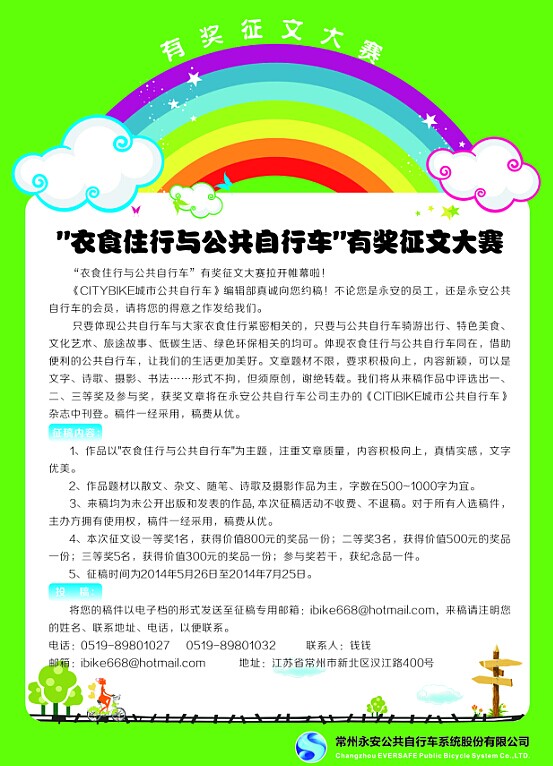 只要體現(xiàn)公共自行車與大家衣食住行緊密相關(guān)的,只要與公共自行車騎游出行、特色美食、文化藝術(shù)、旅途故事、低碳生活、綠色環(huán)保相關(guān)的均可。體現(xiàn)衣食住行與公共自行車同在,借助便利的公共自行車,讓我們的生活更加美好。文章題材不限,要求積極向上,內(nèi)容新穎,可以是文字、詩(shī)歌、攝影、書法……形式不拘,但須原創(chuàng),謝絕轉(zhuǎn)載。我們將從來(lái)稿作品中評(píng)選出一、二、三等獎(jiǎng)及參與獎(jiǎng),獲獎(jiǎng)文章將在永安公共自行車公司主辦的《citibike城市公共自行車》雜志中刊登。稿件一經(jīng)采用,稿費(fèi)從優(yōu)。