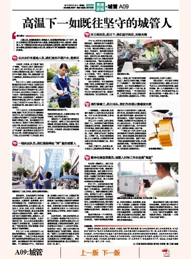 核心提示 入夏以來(lái),高溫降臨我市,驕陽(yáng)如火,地面溫度更是高達(dá)37-38℃,室外工作場(chǎng)所撲面而來(lái)的熱氣令人眩暈,持續(xù)的高溫天氣中,有這樣一群城管人,為了保障城市環(huán)境衛(wèi)生及公共設(shè)施的正常運(yùn)轉(zhuǎn),他們揮汗如雨卻有條不紊地以固有的節(jié)奏和方式工作。高溫天氣“烤”驗(yàn)著保障一線的城管人的意志。