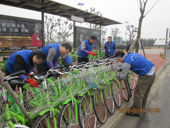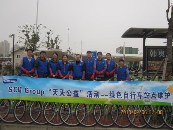 在活動現場有些自行車需要調整零件的,懂自行車維護的同志就自告奮勇的站出來擔當這個任務,有些自行車需要清潔工作的,就拿起抹布認真仔細地擦試,不一會兒工夫一個又一個站點在他們熟練的動作中形成一道道美麗的風景線。三星顯示器有限公司率先從自身做起,將環(huán)保理念深入員工帶動市民,以實際行動支持環(huán)保事業(yè)。