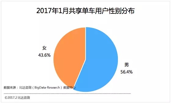 2017年1月共享單車用戶性別分布,男性占56.4%,女性占43.6%。