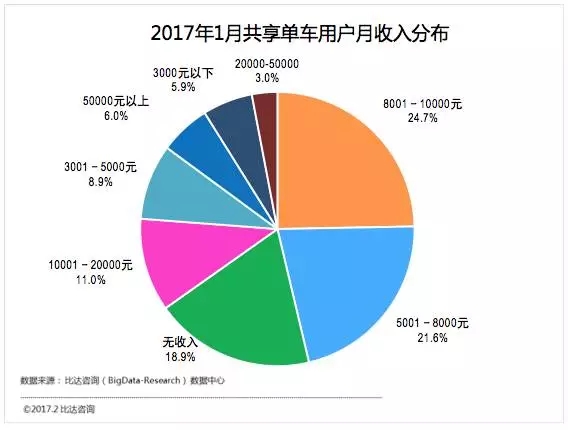2017年1月共享單車用戶月收入分布方面, 8001元至10000萬占比最多,達24.7%;5001至8000元占21.6%;無收入人群多為學(xué)生群體,占18.9%。